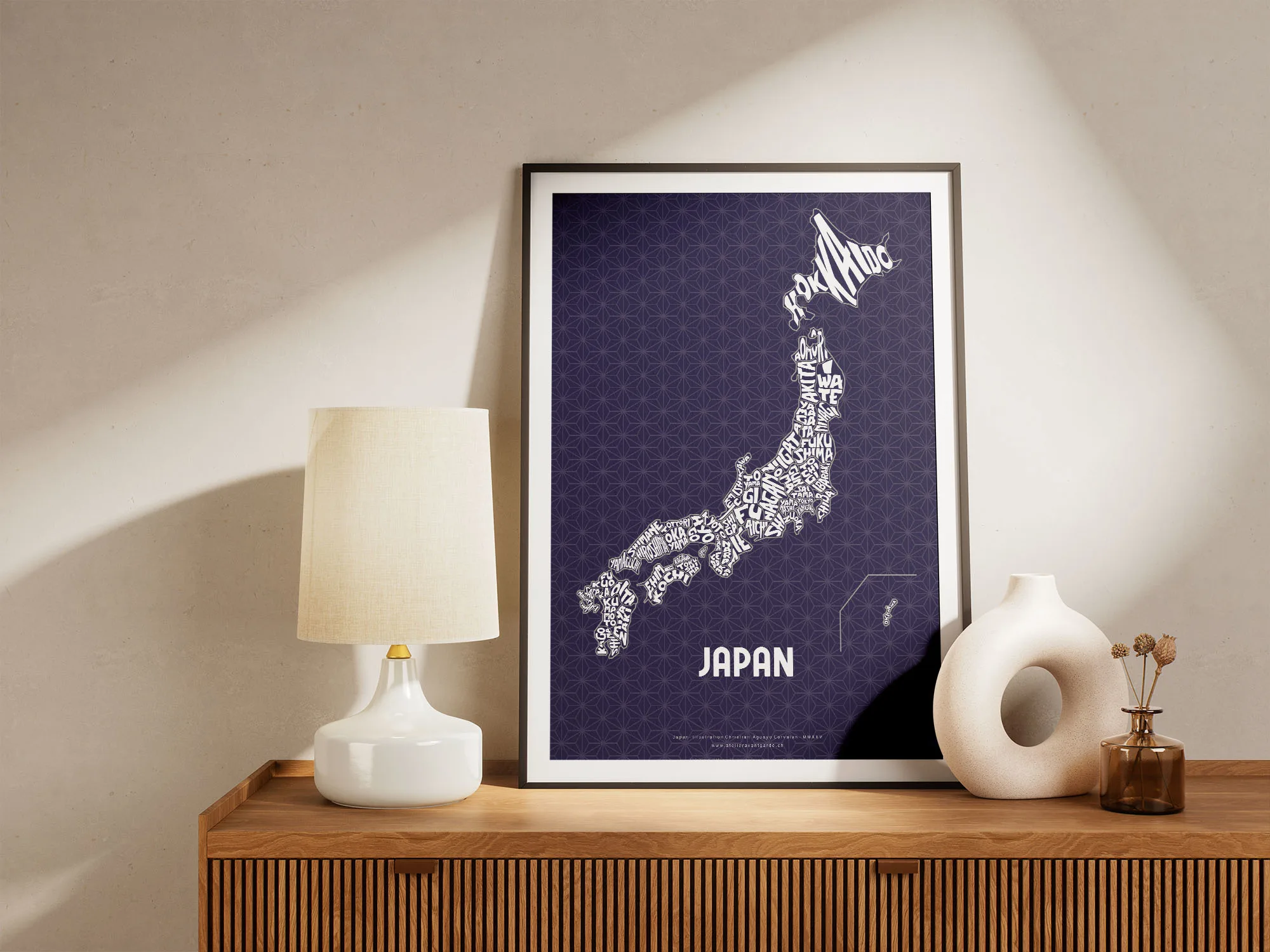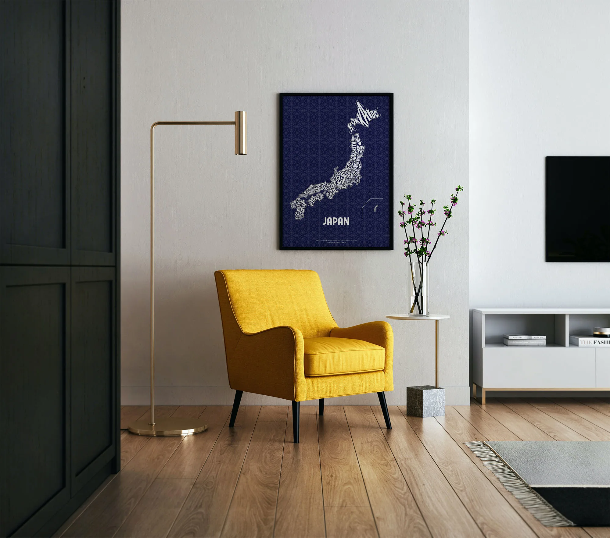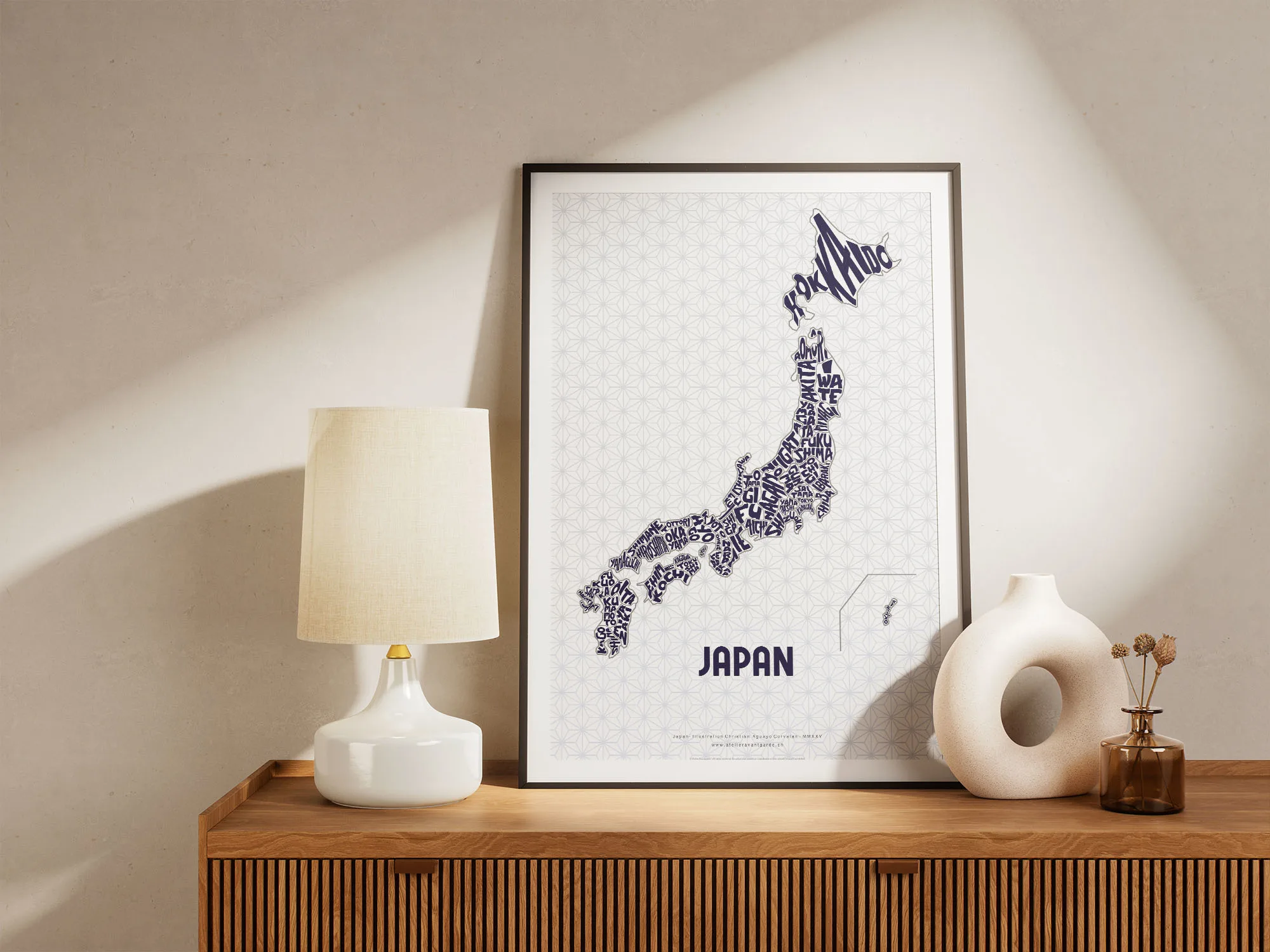 Japan Typographic Poster L size framed, blue version – Modern Graphic Design