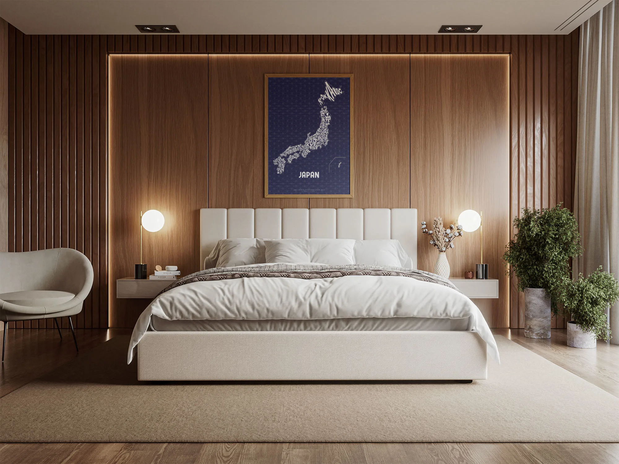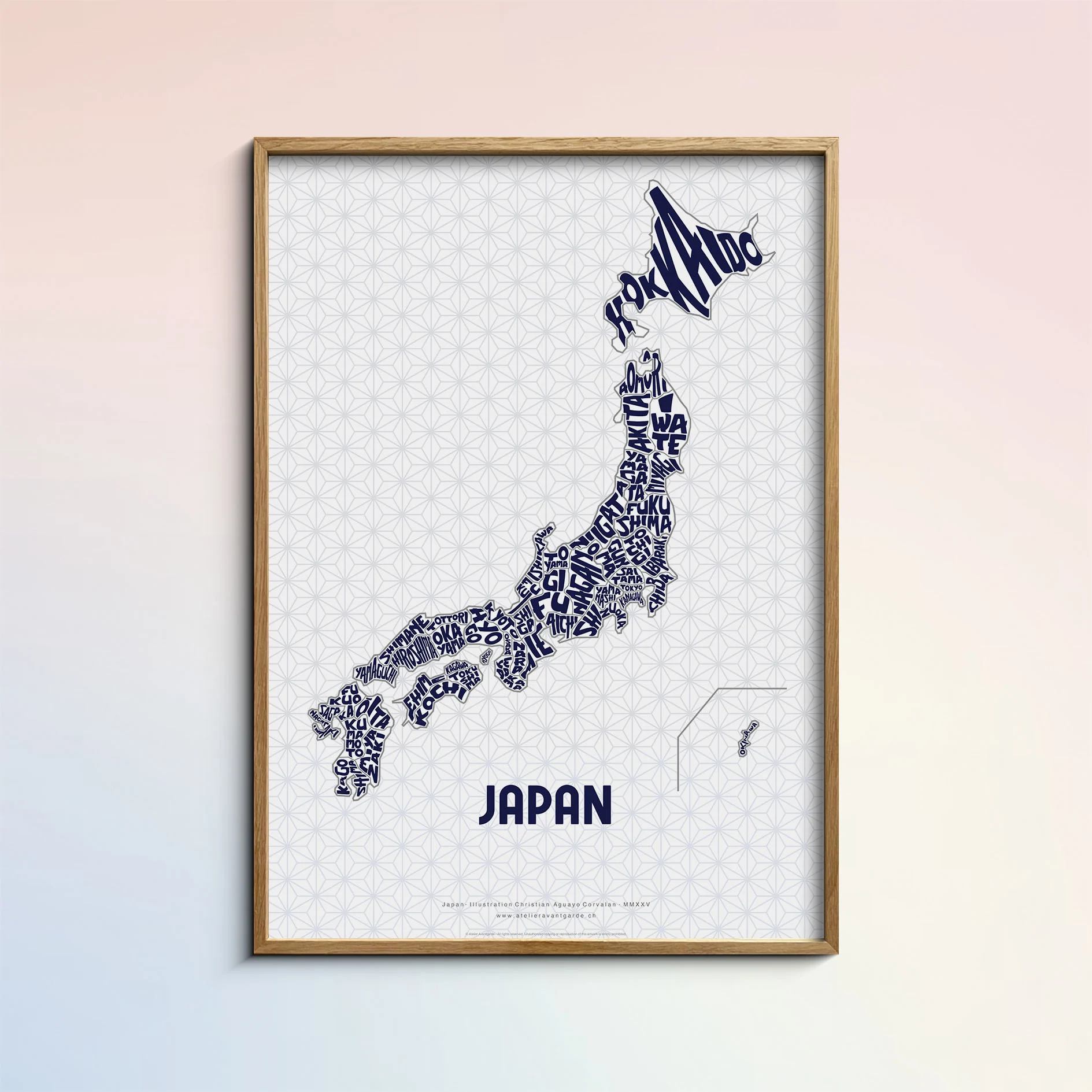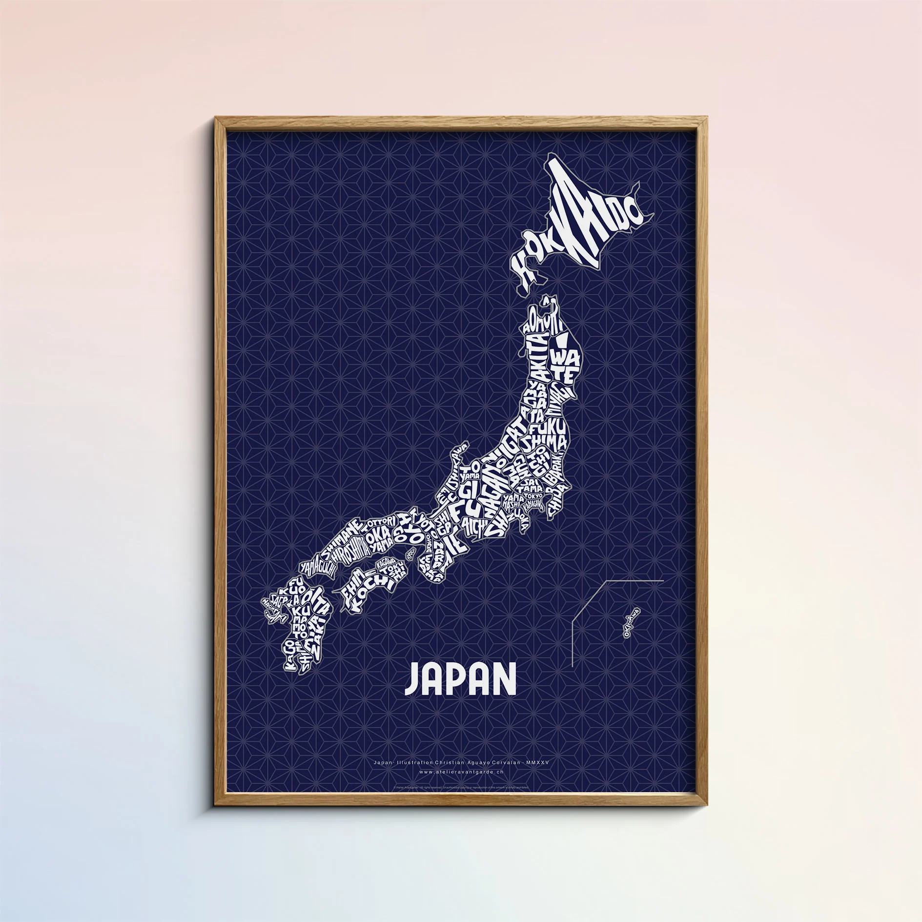 Japan Typographic Poster L size framed, blue version – Modern Graphic Design