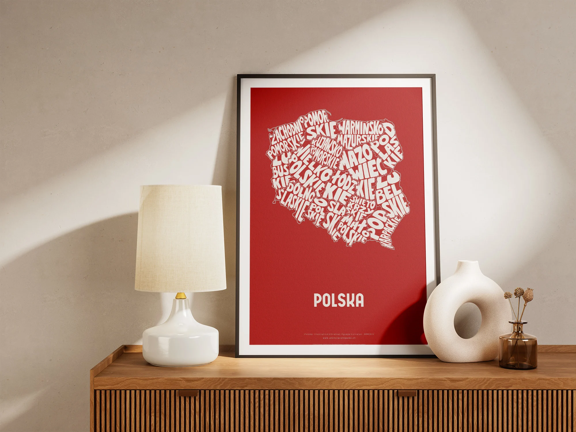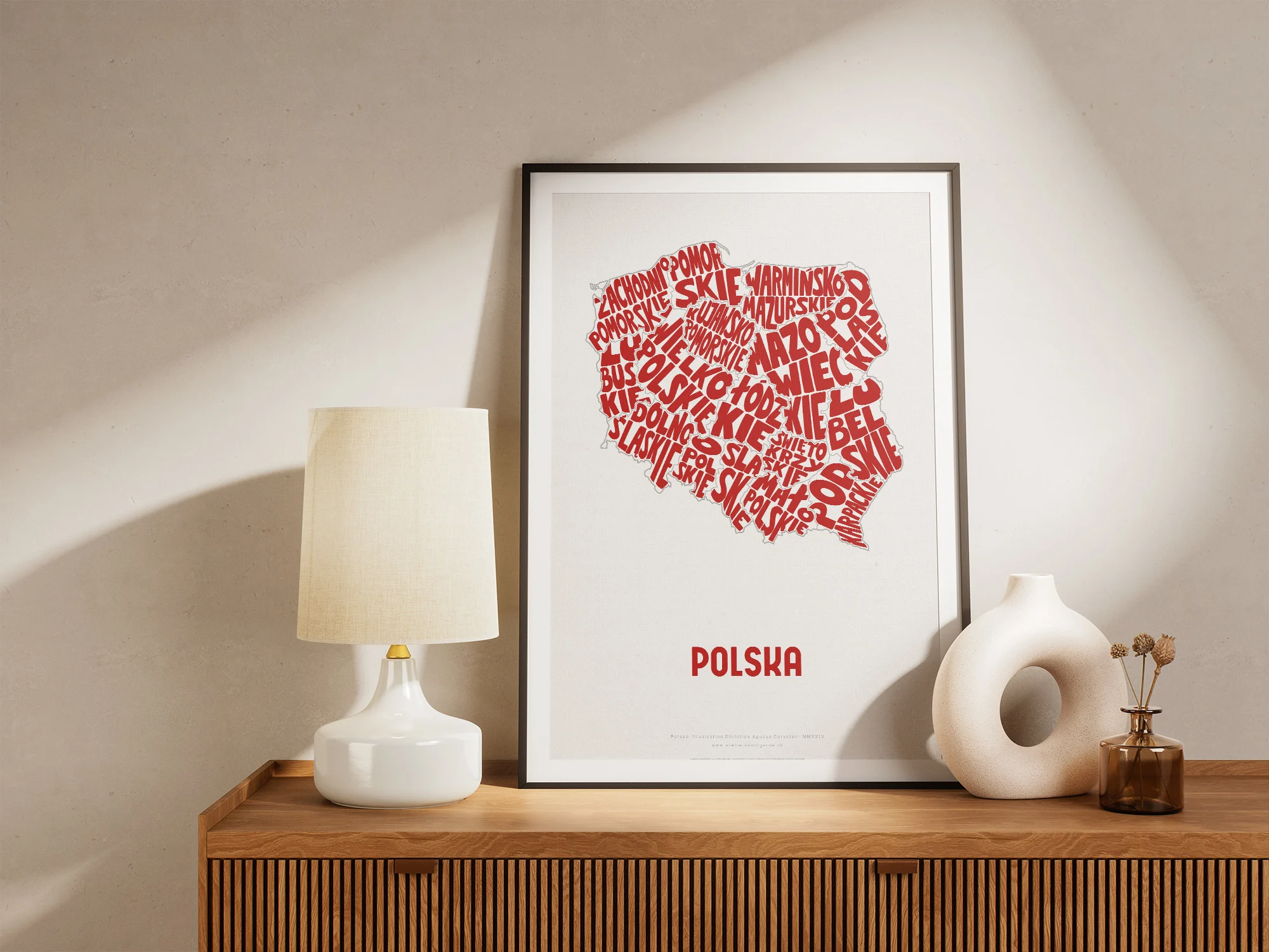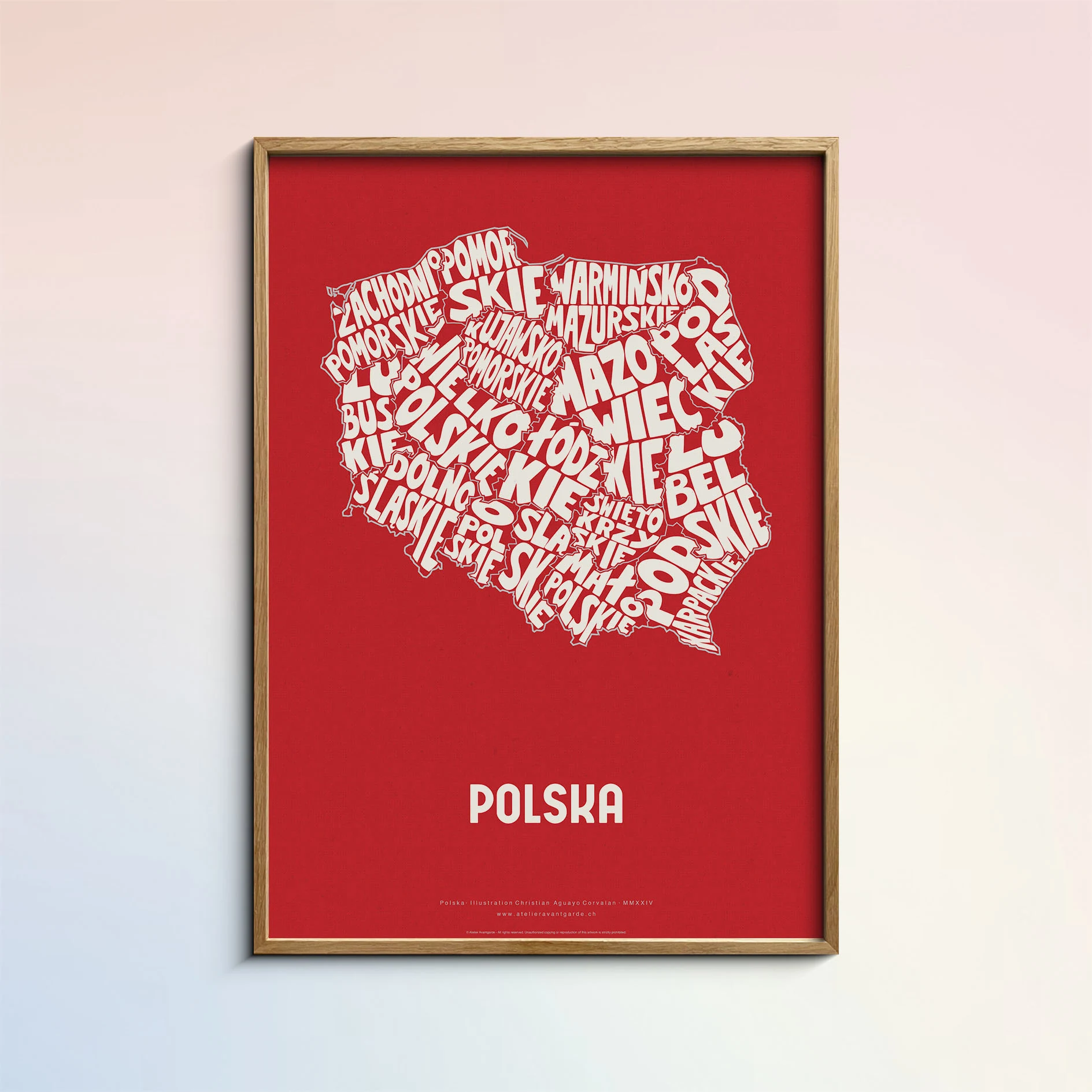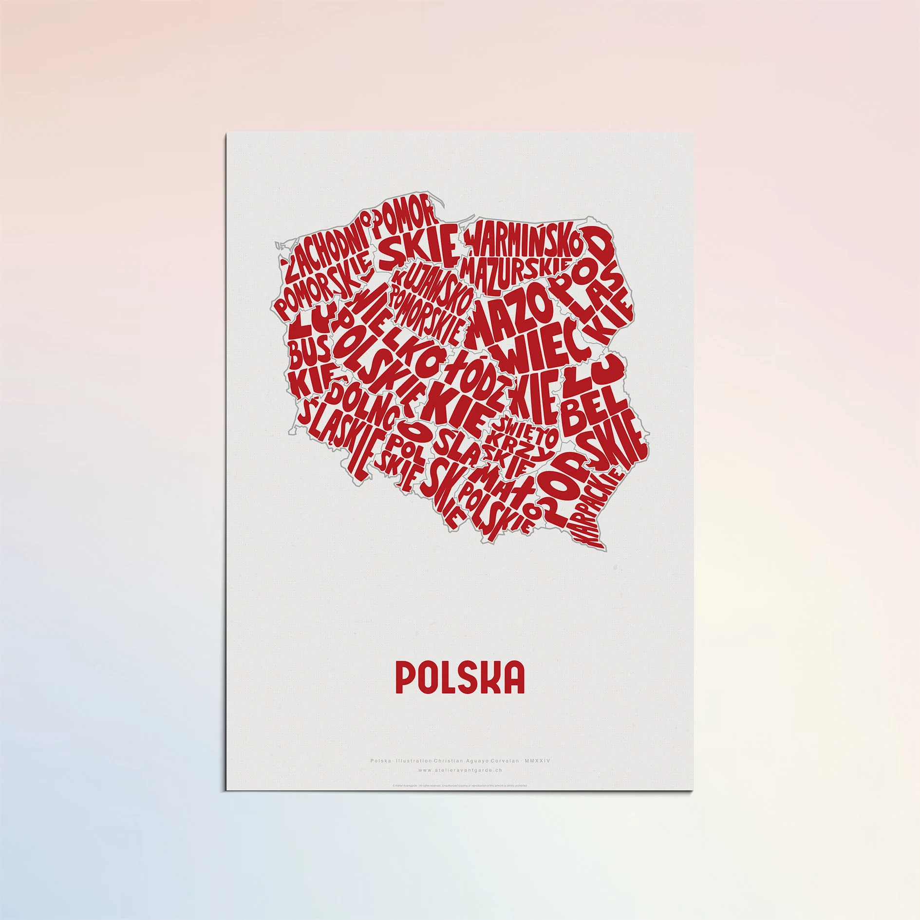 Typographic Illustration of Poland (red on white). Hand-drawn and printed on high-quality paper